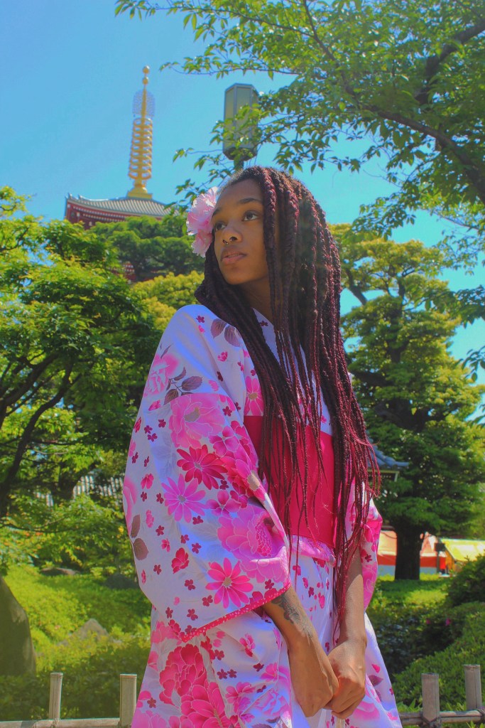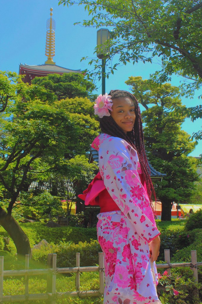 Asakusa is one of the many neighborhoods in Japan, but unlike Shinjuku or Shibuya, it has a more traditional feel to it due to historical landmarks and the unique blend of Japanese culture. It took about an hour and a half train ride to get to Asakusa, and the first thing I did upon arriving was go rent a kimono. I found one place on Google that seemed to have good reviews, but there were many rental shops around. I didn’t make a reservation, but the shop was still willing to take me. I initially wanted a purple kimono, because purple is my favorite color, but they didn’t have any in the shade that I liked. I thought the pink with the flowers was cute, and it matched my hair. The staff were actually surprised that I could speak Japanese. Since Asakusa is another touristy area, there were many other foreigners also wanting to rent a kimono. I think they were taken aback when I responded in Japanese to their question asked in English lol.