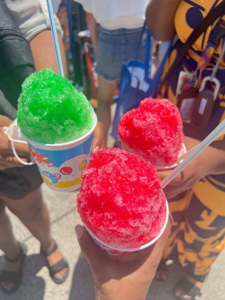 The festival itself was outside at one of the landing areas, I think. I don’t quite remember what Sienna said. People had picnic blankets out, there were food stalls, and music was playing. Like I said, it truly reminded me of the state fair, but it was a fun fusion of Japanese and American. Of course, there were things like hamburgers and hotdogs, beer and of course the most American thing ever, fried oreos. But there were also Japanese foods like yakuniku and soba. Most stands accepted both the yen and the U.S dollar (paying in yen was typically cheaper). It was so hot though, so the first thing we did was get shaved ice.
