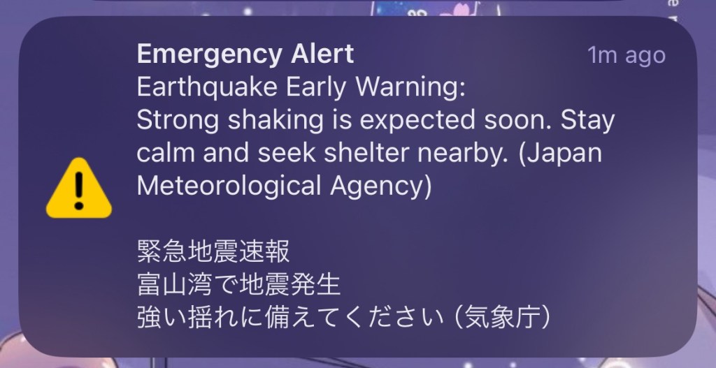 This morning, around 6:31AM JST, I had the pleasure of being startled awake by my phone screaming at me that there was an earthquake. Now, back home, we don’t have earthquakes in the Midwest. Even when I was in California during the summer, I hadn’t, luckily, experienced one. So being woken out of your sleep by your phone issuing what’s basically an amber alert, is terrifying. On top of that, my roommate’s phone was issuing the same alarm, so the two of us were groggy, confused, and concerned.