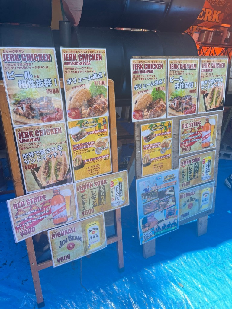 The first thing Sam and I decided to get was a drink lol. We saw several stands selling things like Jamaican Jerk chicken, tacos, and then a stall with Daiquiris caught our eyes. I went for the pineapple one and Sam got mango. While it was good, I don’t think they added that much alcohol into it. And once it started to get really hot outside, the ice melted and really watered it down. I still paid 800¥ or $5 for it so I was going to finish it. I also got my first meal cause I had plans to try whatever looked good (which was everything). I got a Jamaican Jerk Chicken sandwich from this stall called Good Wood Terrace. Come to find out, the stall has a physical restaurant in Shibuya! They gave us stickers. There’s a whole Jamaican restaurant in Tokyo and I didn’t even know it lol. I’ll definitely have to try out the physical restaurant.