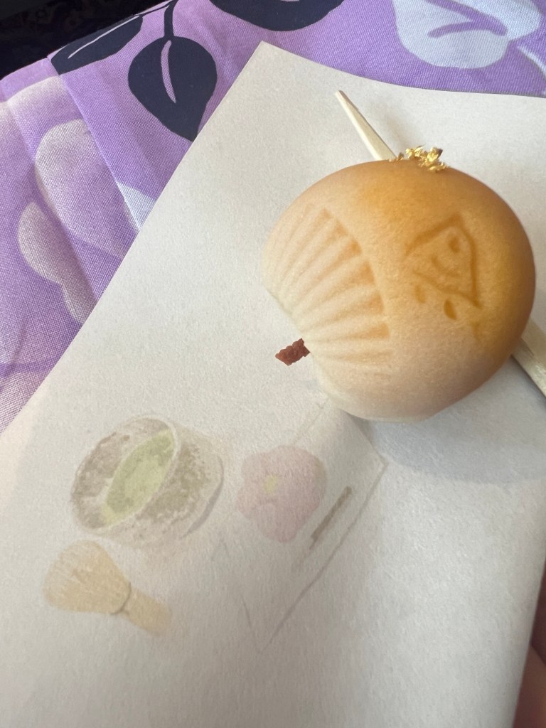 To make the tea, you put one and a half scoops of the matcha powder in your bowl. Then you add about 87ml ( I think it was milliliters) of hot water. You use this whisk called a “chasen” which is made from bamboo. It has several thin tines to help whisk the matcha into an almost foamy liquid. You whisk it back and forth and once it foams up, you circle around in a の shape to make sure to get the excess powder from the side. So the slight problem was that I’m left handed…so it was kinda backwards for me. They were first trying to correct me at first, but I was trying to explain I’m left handed. I can’t do anything with my right hand without making a mess.